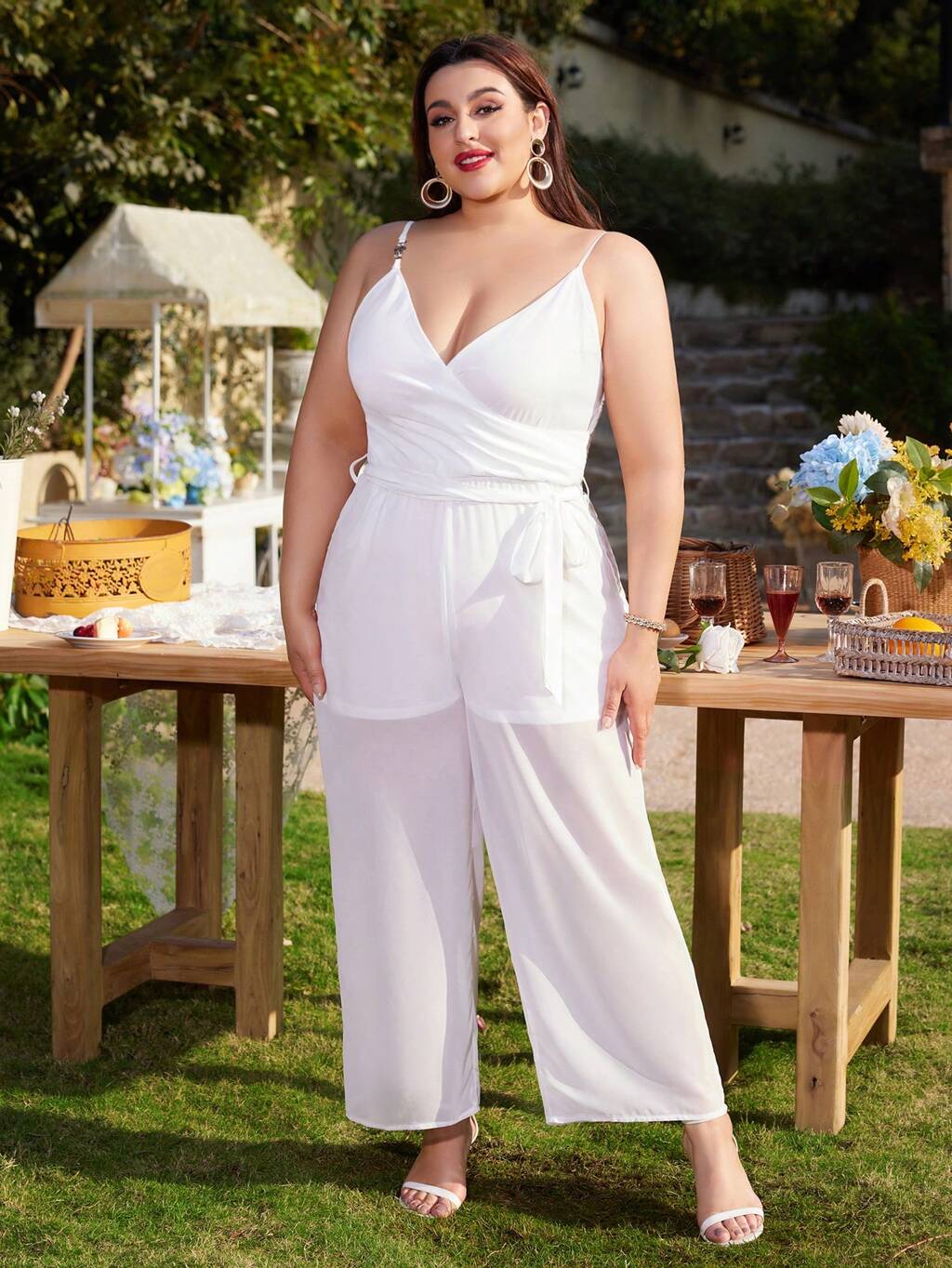Plus Size Solid Color V-Neck Cami Loose Fit Jumpsuit With Wide Straps And Straight Legs