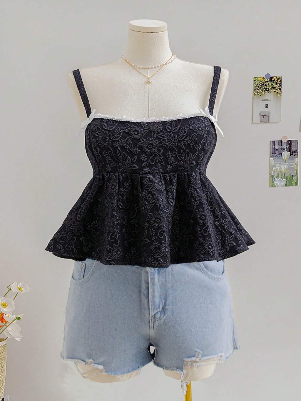 Plus Size Women's Square Neck Lace Splice Black Woven Texture Fabric A-Line Waist Cut Out Tank Top, Beach Vacation Style