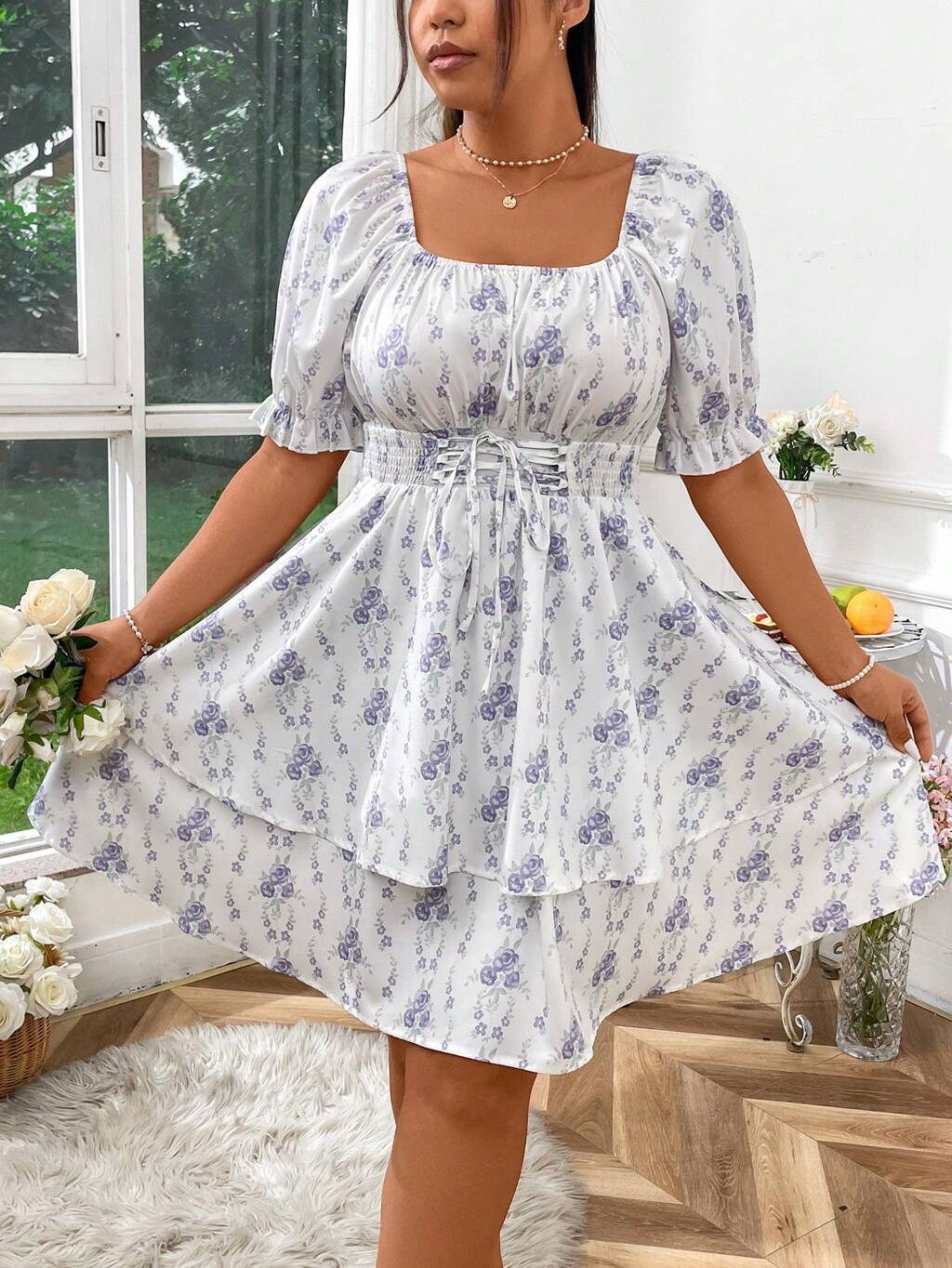 Plus Size Summer Casual Lace Sweetheart Collar Puff Sleeve Floral Shirt