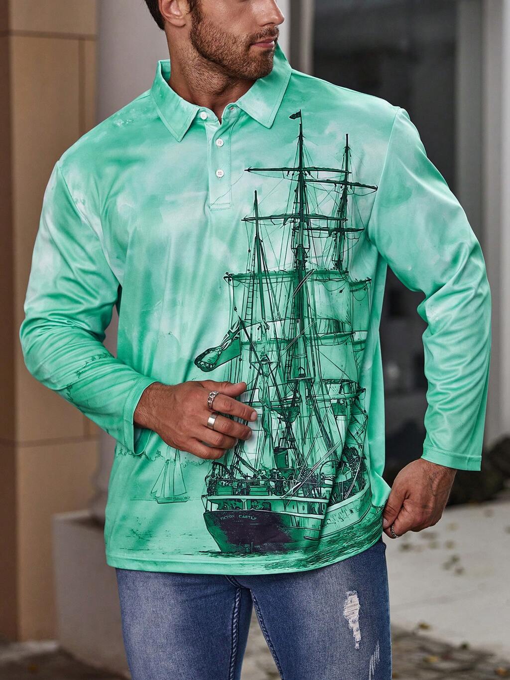 Men Plus Sailboat Print Tie Dye Polo Shirt