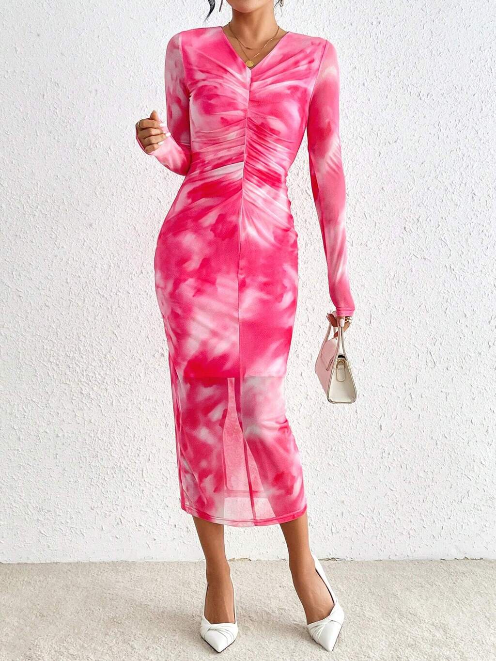 V-ausschnitt Tie-dye Kleid Mit Taille-plissee