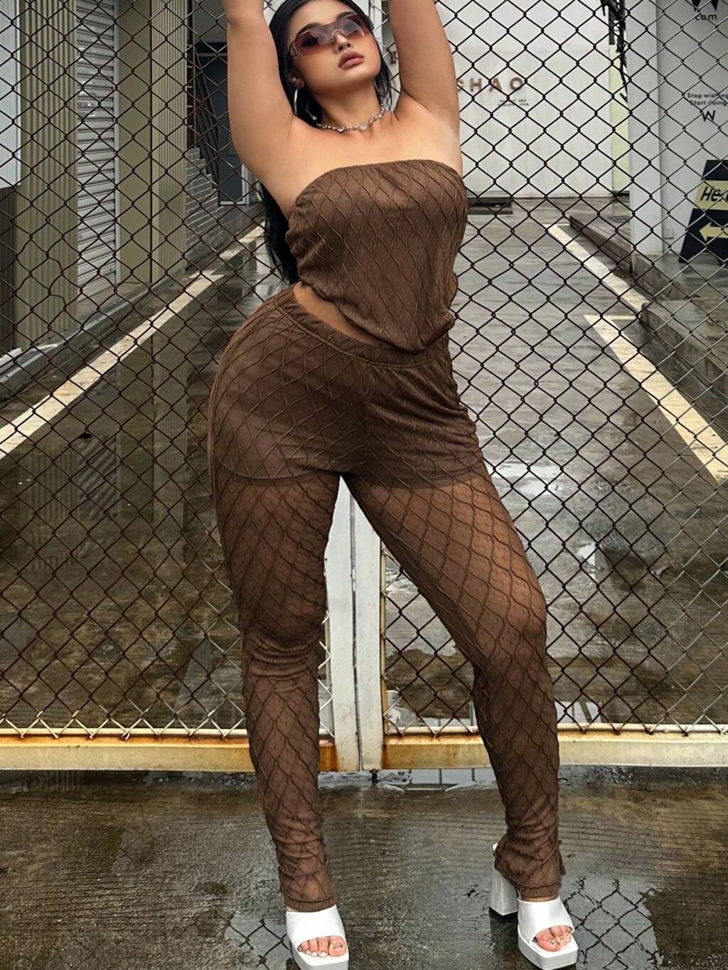 Top sans bretelles élégant grande taille avec texture ajourée, dos exposé et pantalon à jambes larges