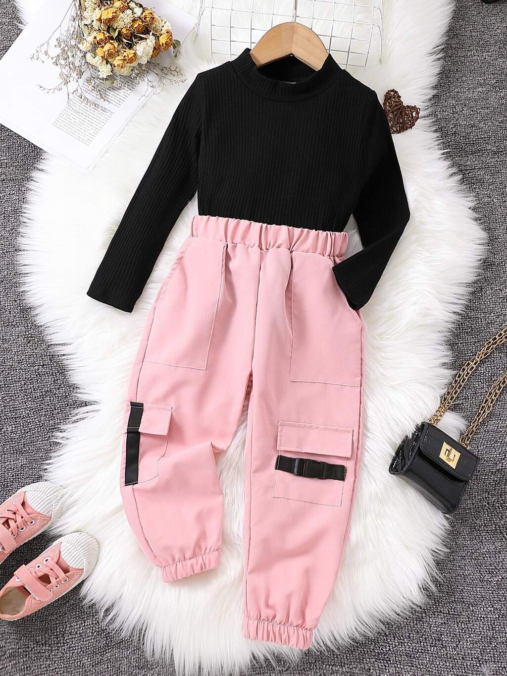 Jeune Fille À Col Montant T-shirt & Ruban À Boucle Poche À Rabat Pantalon