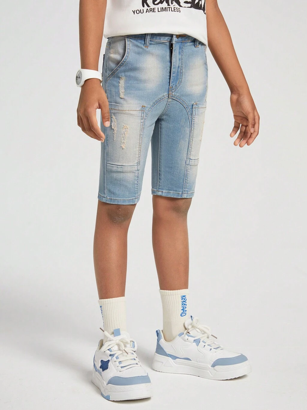 Pantaloncini di jeans casual strappati e scoloriti con alto stretch per ragazzi pre-adolescenti, adatti per l'estate