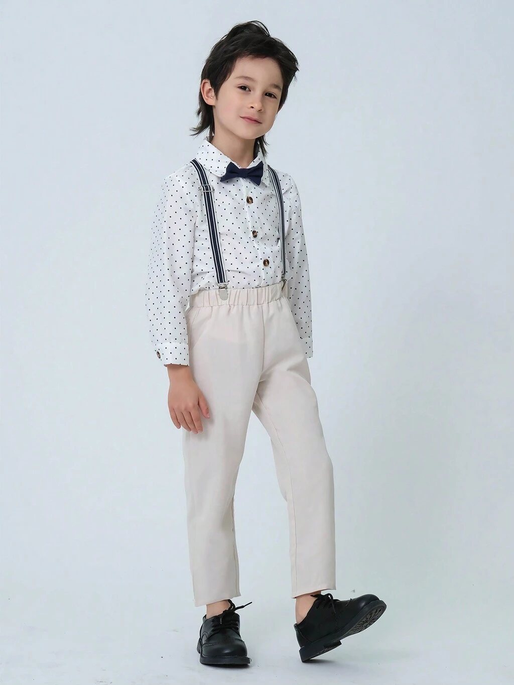 Completo elegante da ragazzo in due pezzi, composto da una camicia bianca a pois a maniche lunghe con papillon regolabile, e pantaloni casual in tessuto color cammello. Questo completo da gentiluomo in due pezzi è adatto per feste di compleanno, serate, eventi, matrimoni, battesimi e feste per il primo anno di età.