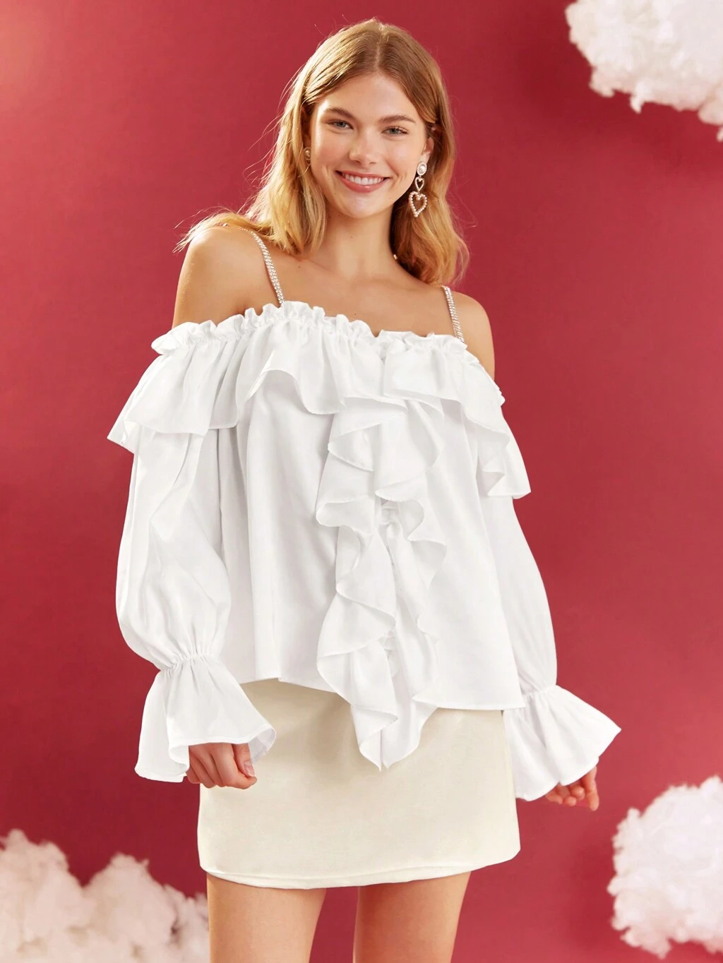 女性用ラインストーンとパール付きフリルトリムブラウス、ビーズディテール付き