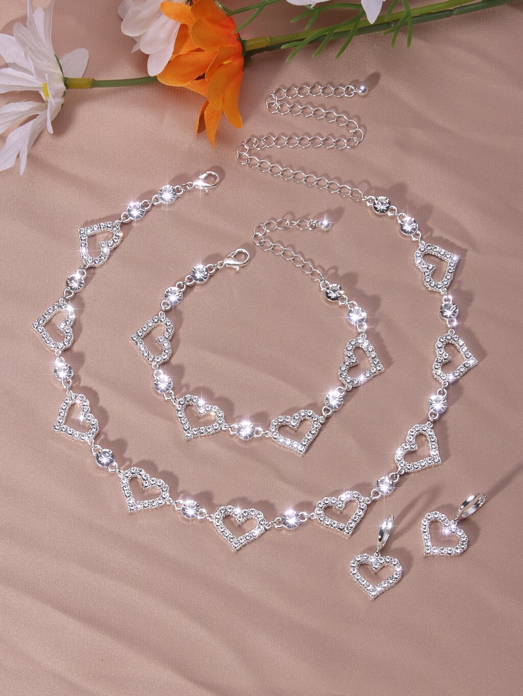 반짝이는 라인스톤으로 장식된 쥬얼리 세트 - 중공 하트 모양 비즈 초커 목걸이 & 드롭 이어링 & 조절식 체인 팔찌 액세서리, 발렌타인데이 선물