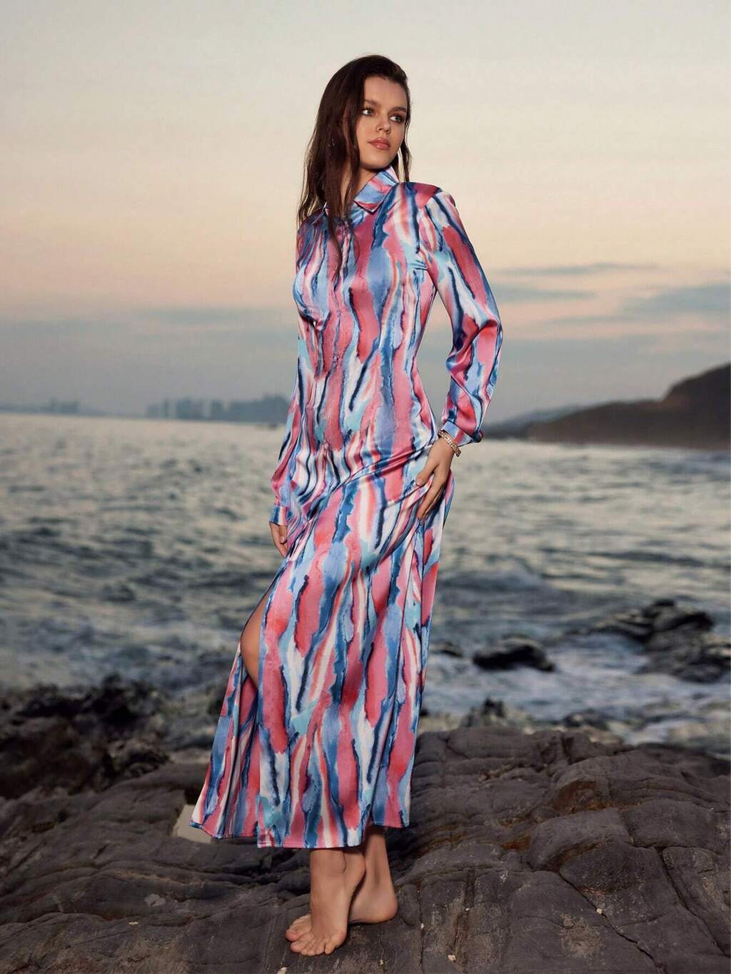 여성용 완전히 프린트 된 롱 슬리브 셔츠 드레스