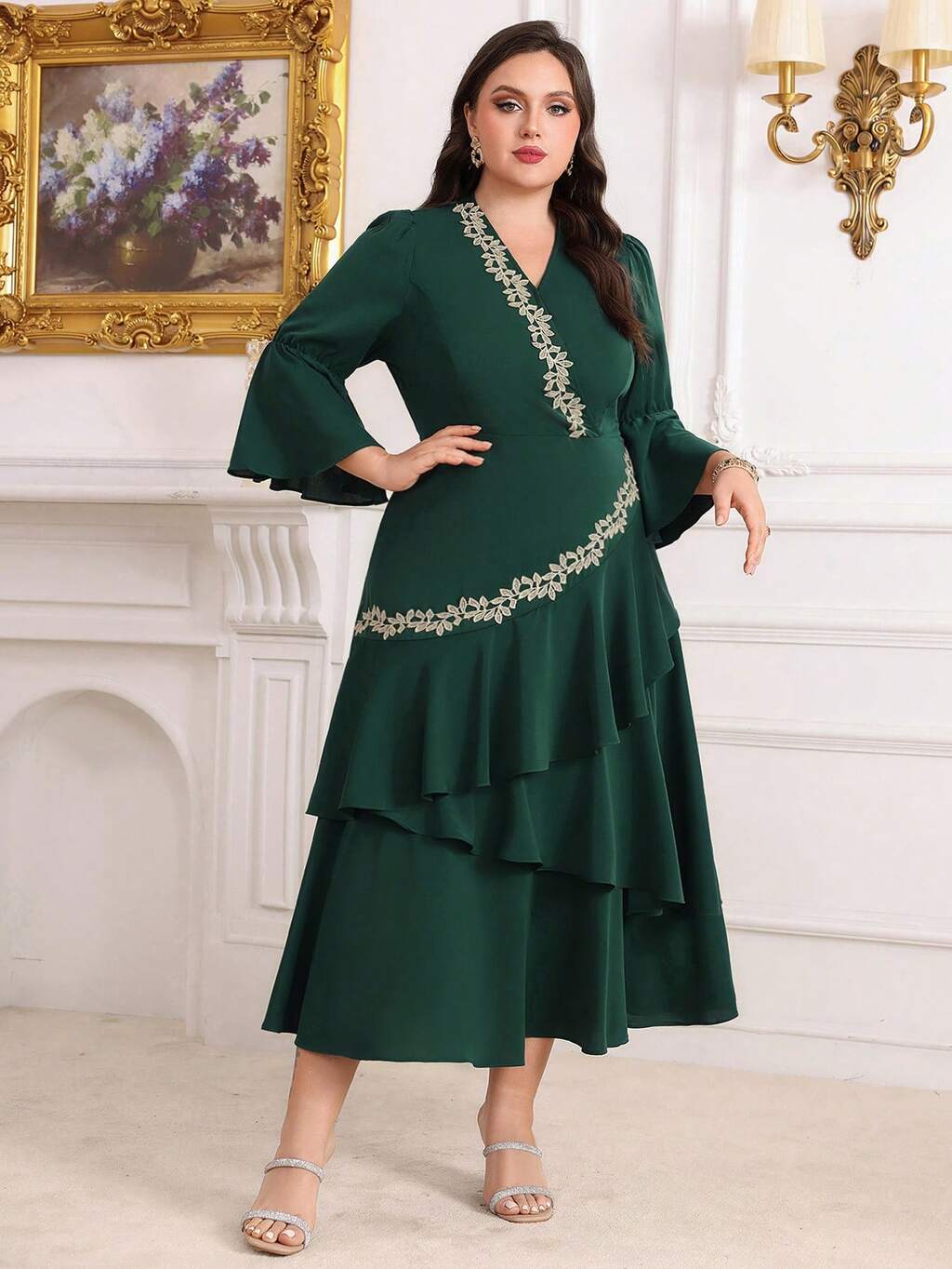 Plus Size V-Neck Lace Patchwork Ruffle Dress,Elegant Evening Party Dress Long Evening Dresses