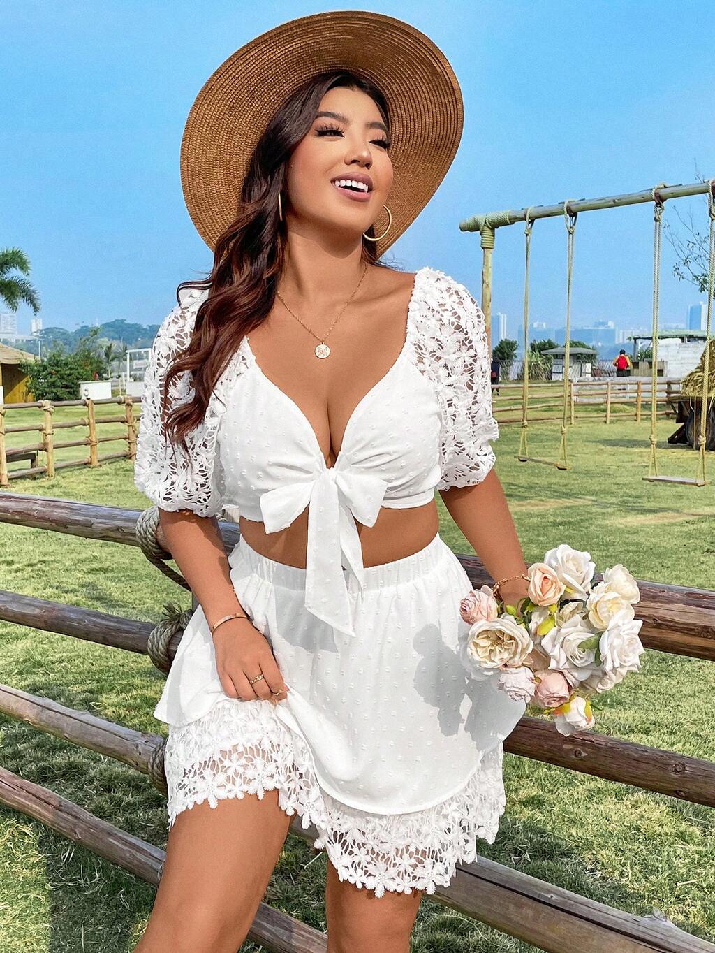 Plus Size Lace Raglan Sleeve Tie Front Jacquard Cropped Top And Skirt Set