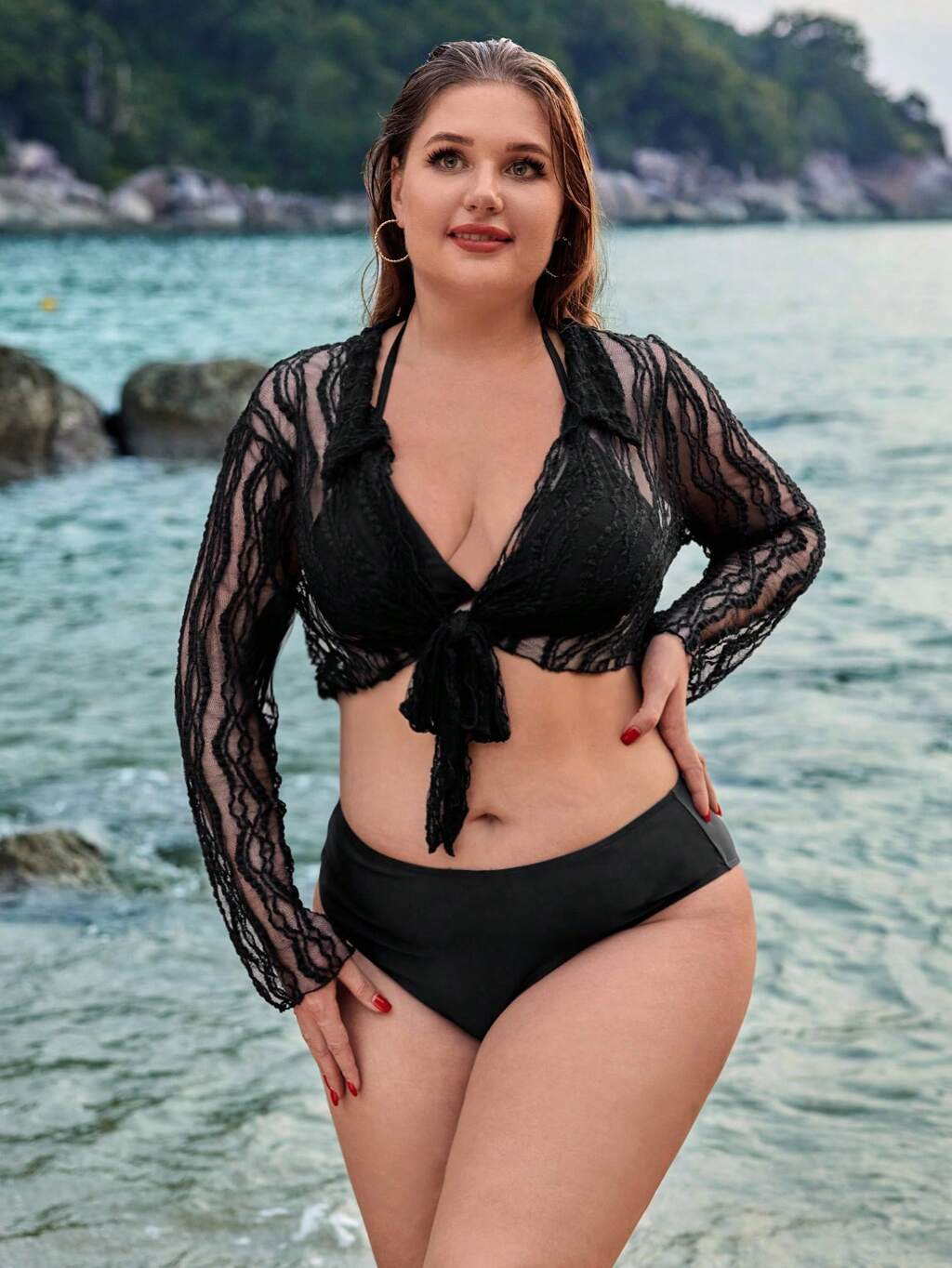 Plus Size Solid Color Halter Bikini With Drawstring Summer