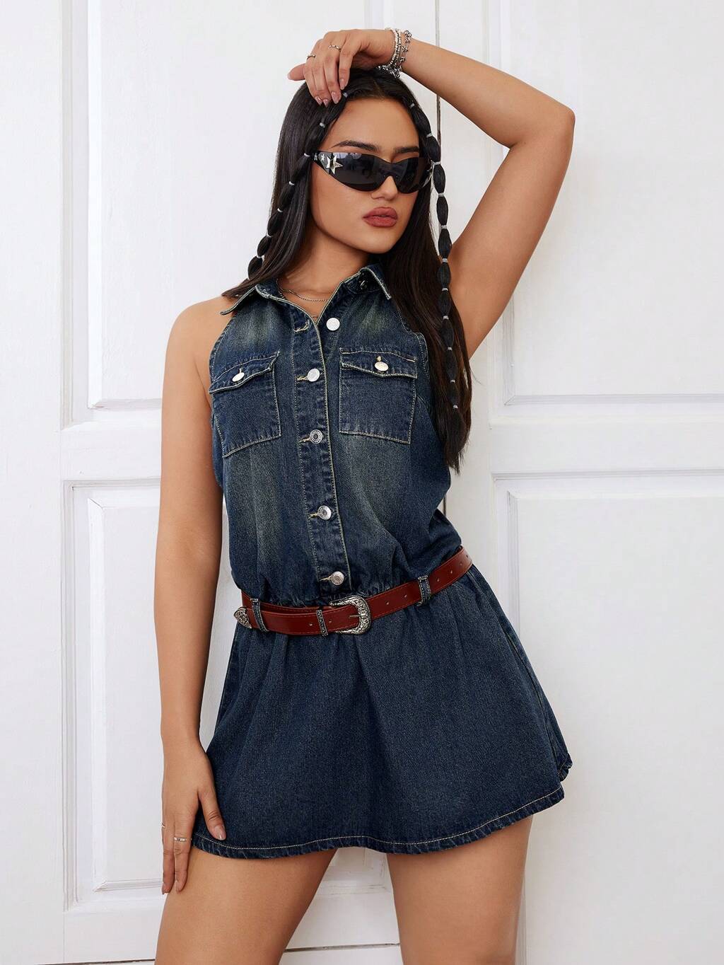 Women's Buckle Belted Decorated Denim Jumpsuit Dress