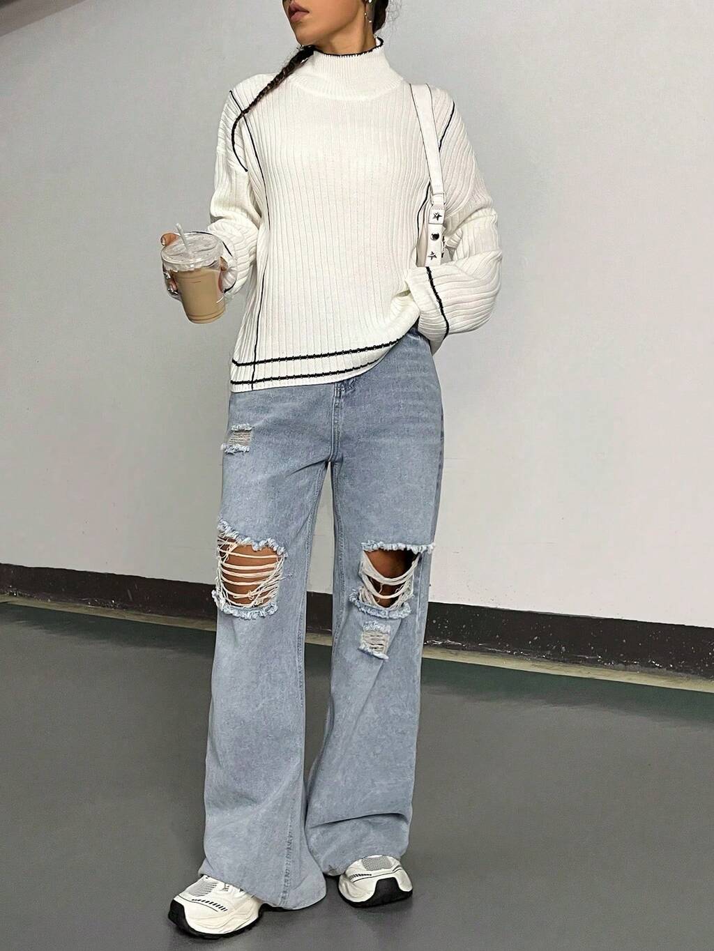 Mock Neck Drop Shoulder Contrast Binding Knit Pullover Fall Winter Sweater