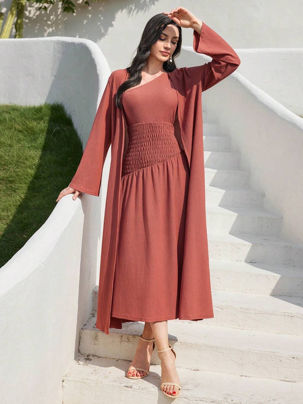 Ladies' Solid Color Round Neck Flare Sleeve Dress + Embroidered Detail Jacket 2pcs Outfit 2 Piece Set