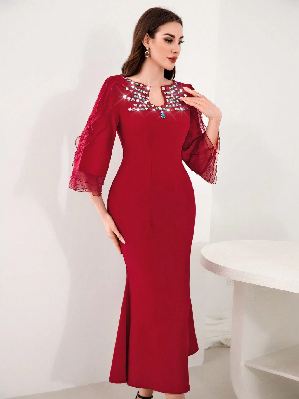 Summer Elegant Rhinestone Decorated Ruffled Back Crossed Cinched Waist Fish Tail Dress Long Evening Dresses