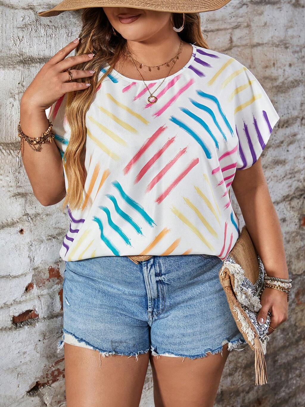 Plus Size Summer Casual Round Neck Striped Printed Batwing Sleeve Loose Shirt