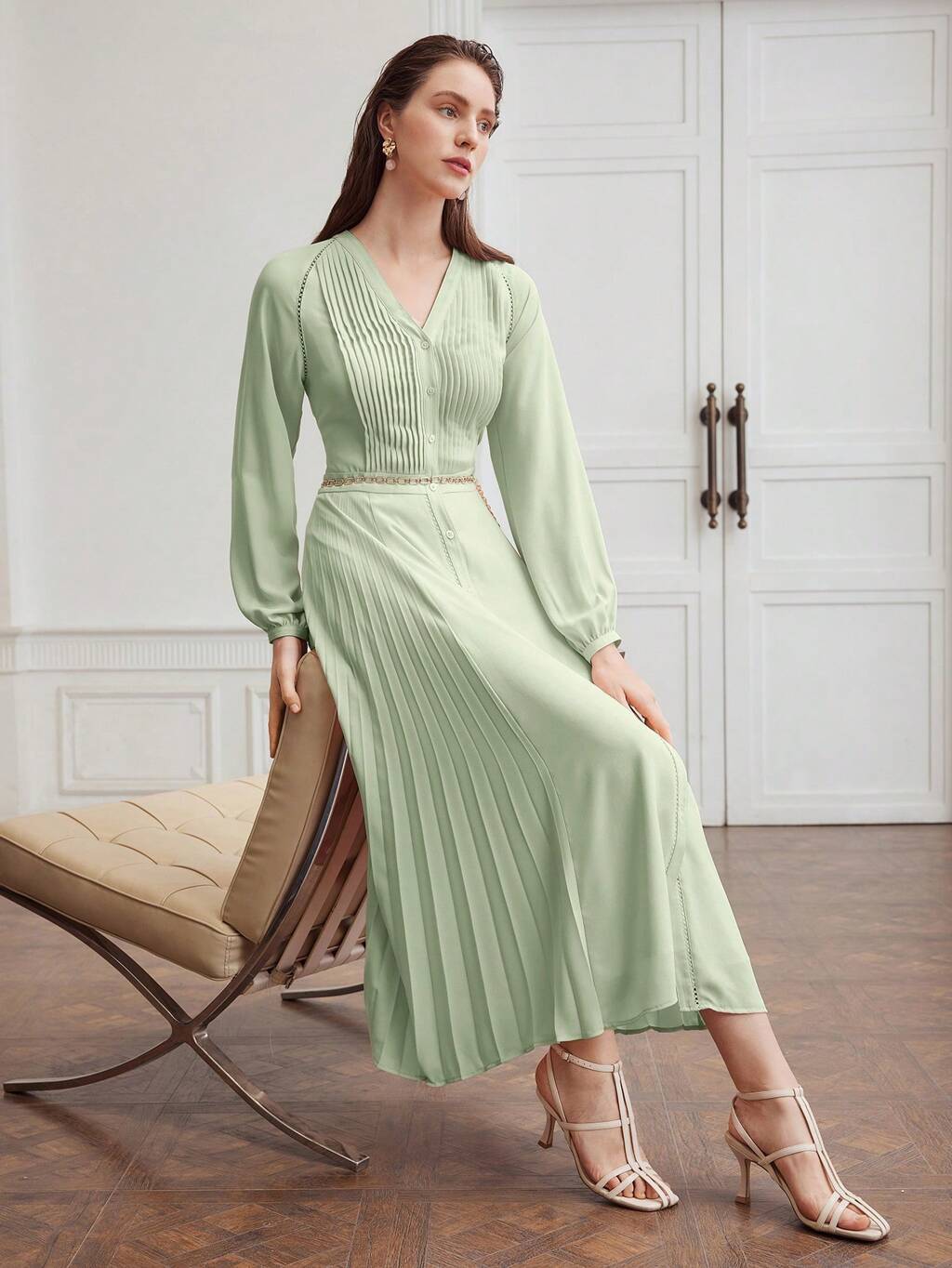 SOLID V-NECK LANTERN SLEEVE PLEATED PANEL DRESS