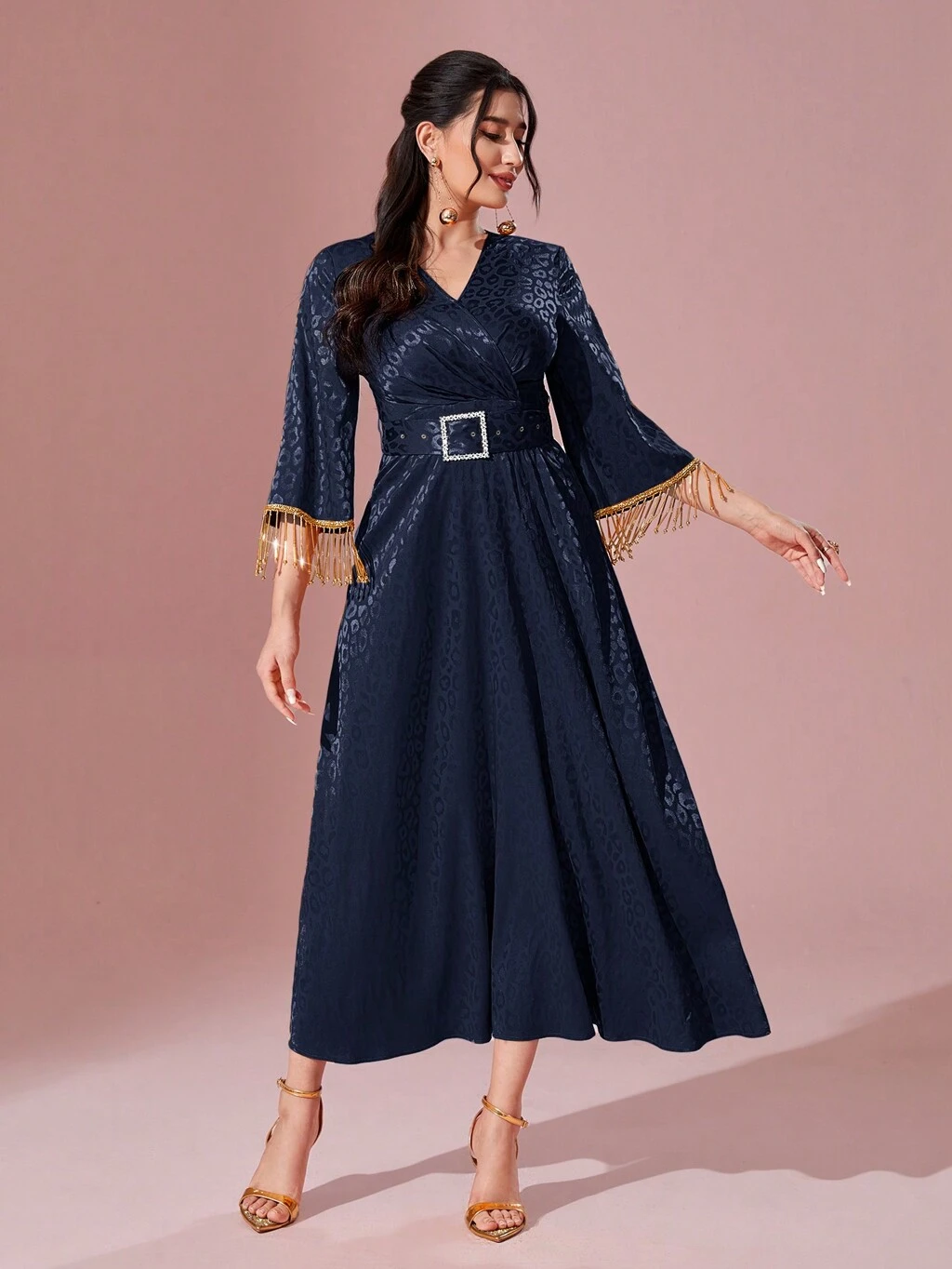 Women's Leopard Jacquard Arabian Dress With Beaded Fringe Cuff