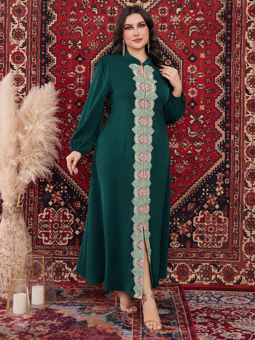 Plus Size Embroidered Decor Lantern Sleeve Arabic Clothing Kaftan Jalabiya Dress