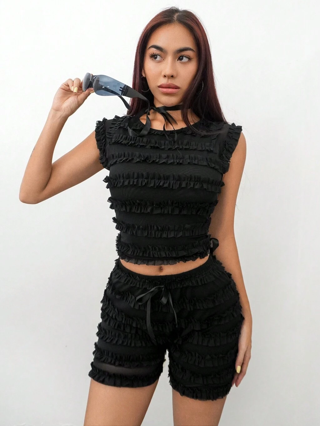 Women's Summer Solid Color Round Neck Symmetrical Ruffle Hem Top And Shorts Casual Set