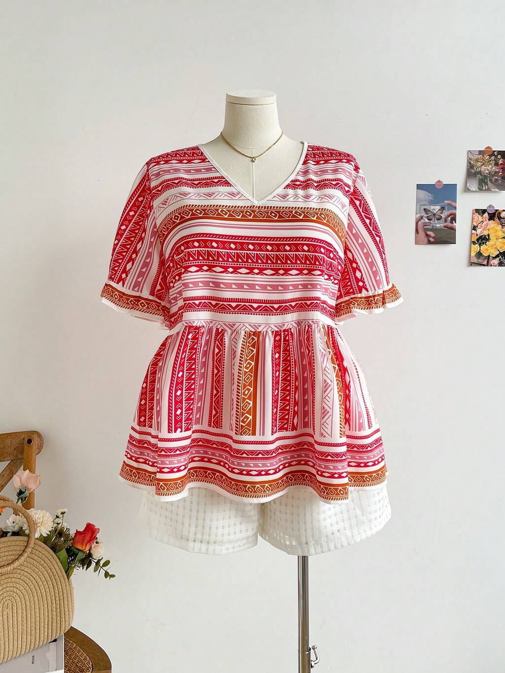 Plus Size Summer Casual Random Printed Batwing Sleeve Blouse