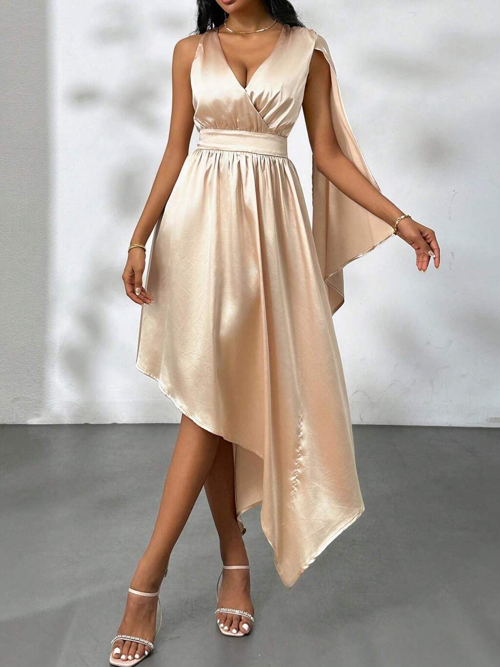 Women Elegant Summer Casual Asymmetrical High Neck Cold Shoulder Sheath Mini Dress With Pleats