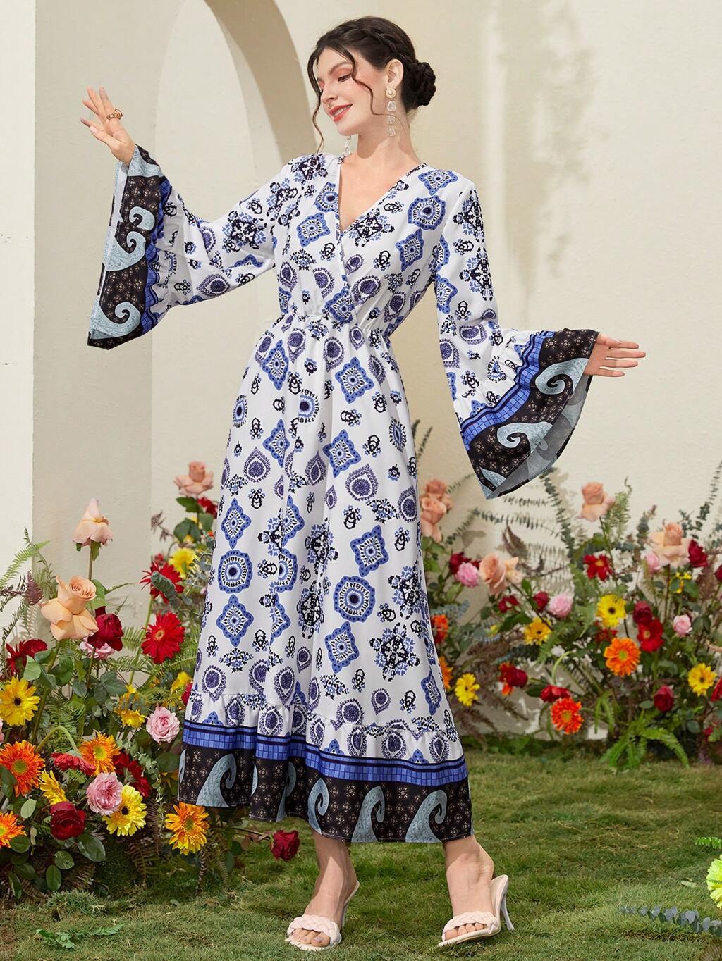 Women's Floral Print Flare Sleeve Dress Fall Cloth For Women
