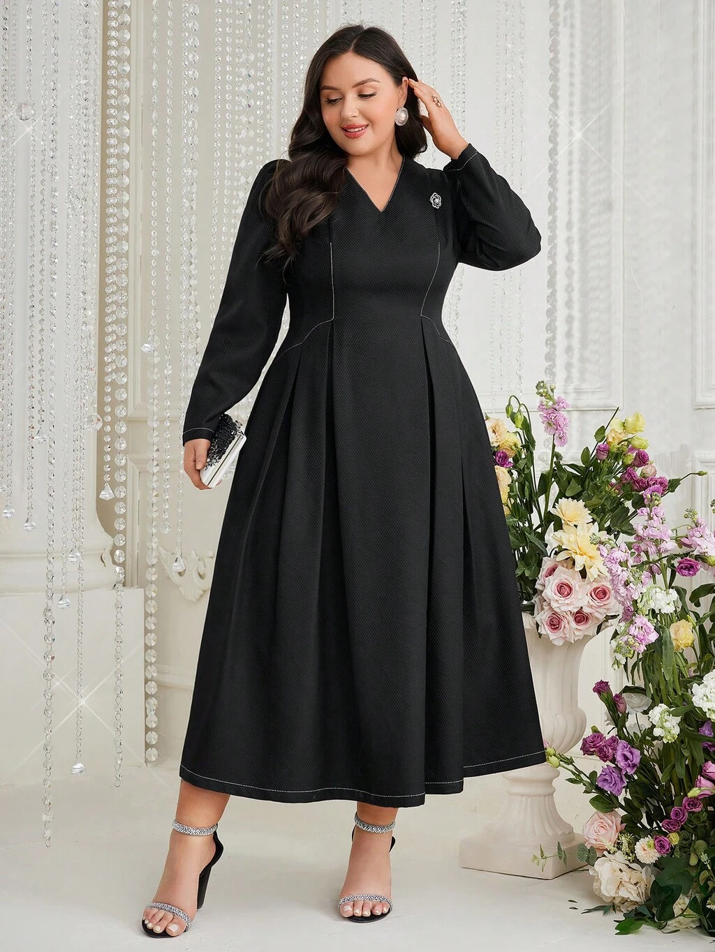 Plus Size Diamond Decorated Long Sleeve Dress Long Evening Dresses