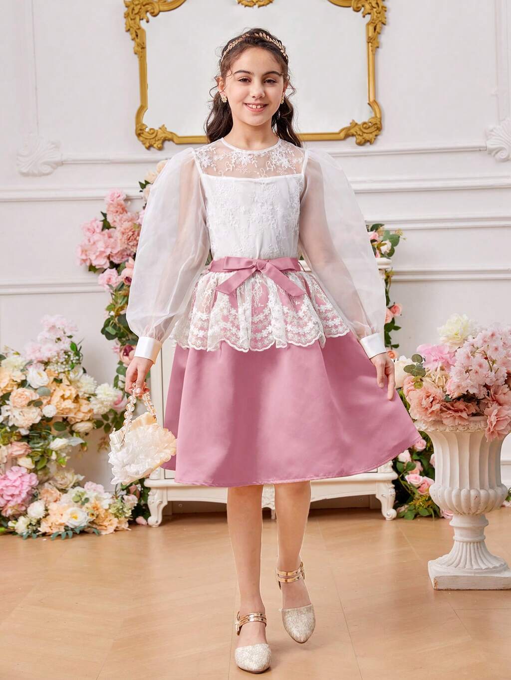 Tween Girl Round-Neck Lantern Sleeve Mesh Embroidery Shirt With Detachable Waist Belt & Skirt Suit Set