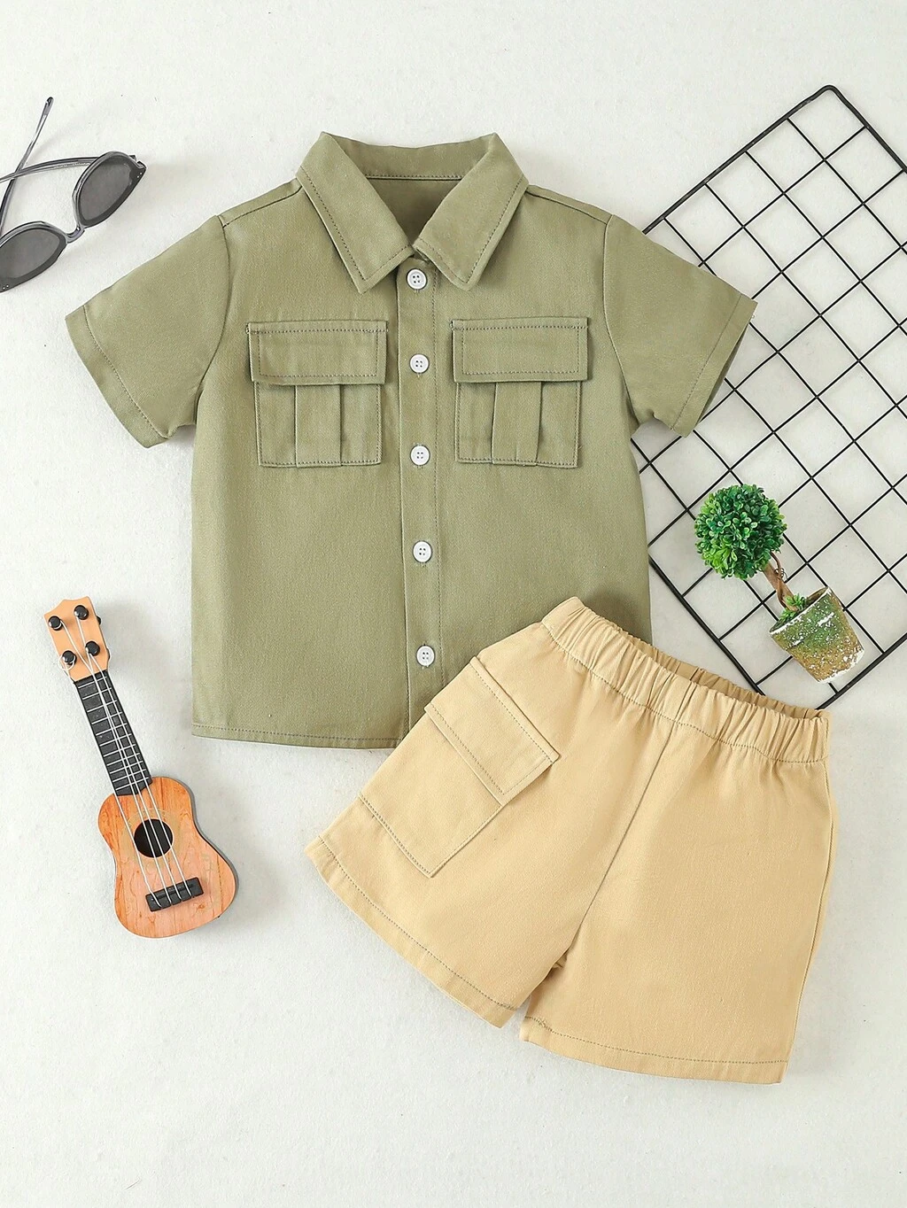 2pcs/Set Young Boy Tropical Plant & Animal Printed Short Sleeve Shirt And Shorts