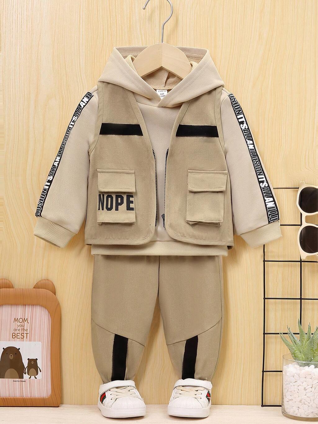Baby Boys' Outdoor 3pcs/Set Workwear Style Vest, Hooded Sweatshirt, Elastic Waistband Pants Outfits