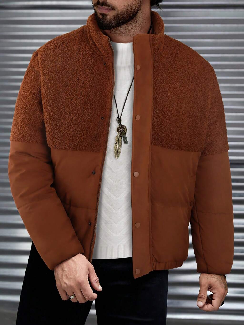 Men Contrast Teddy Snap Button Front Loose Padded Coat