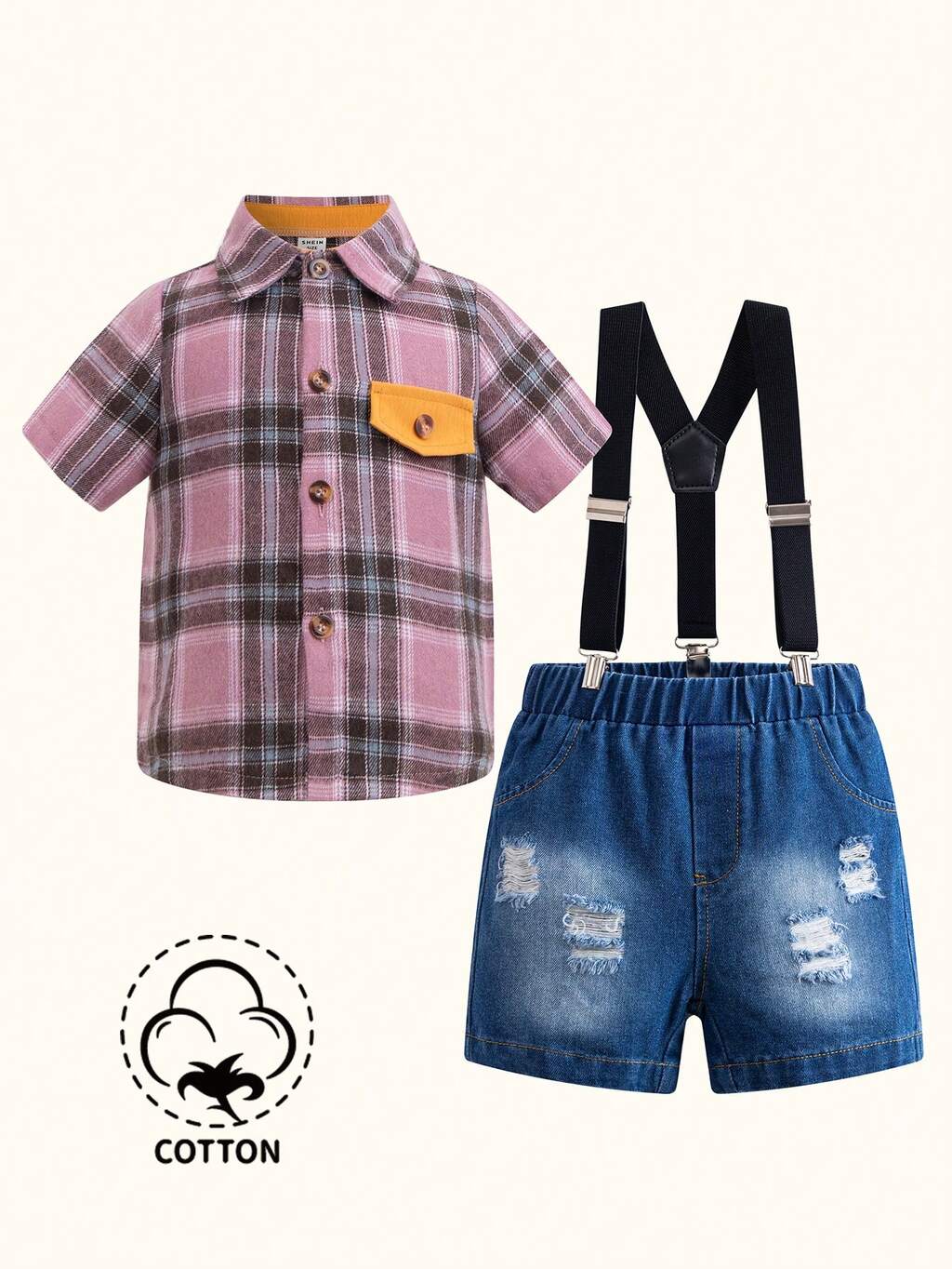 2pcs/Set Spring/Summer Baby Boys' Short Sleeve Plaid Shirt And Distressed Denim Overalls Shorts Fashion Outfits
