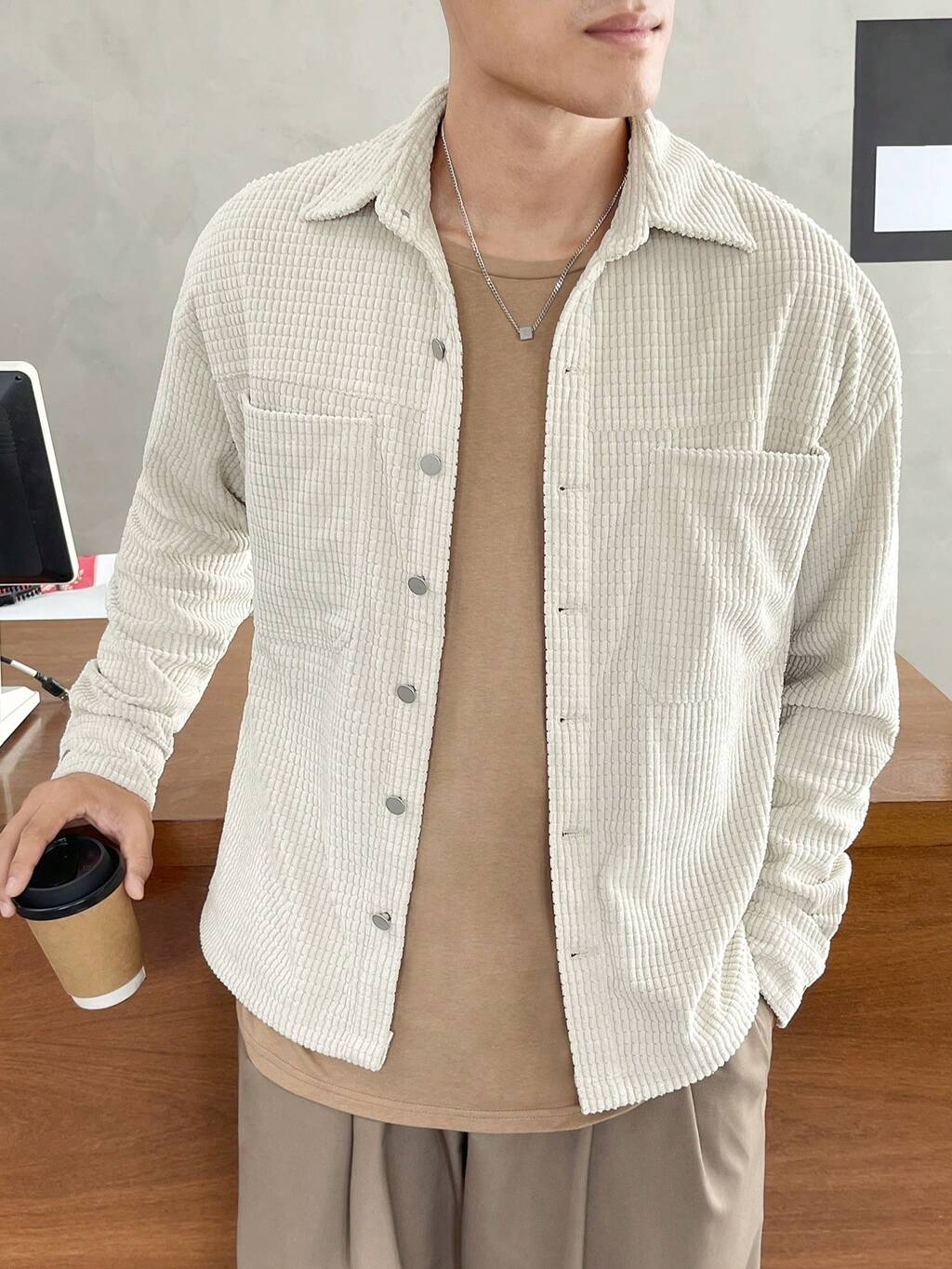 Men's Textured Front Button Long Sleeve Casual Woven Shirt, Autumn