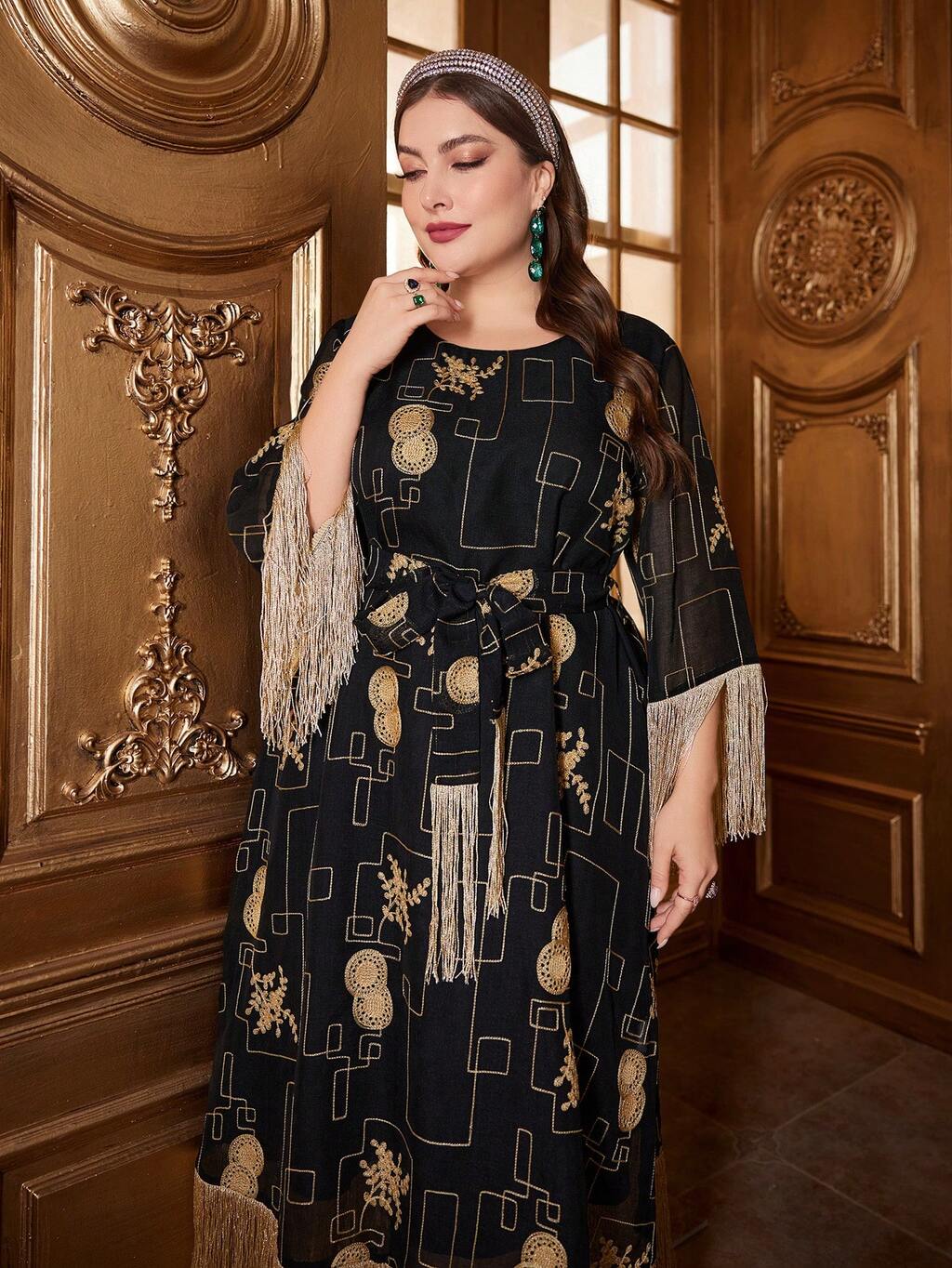 Plus Size Fringed Decor Belted Jalabiya Dress, Elegant Luxury Evening Party Style