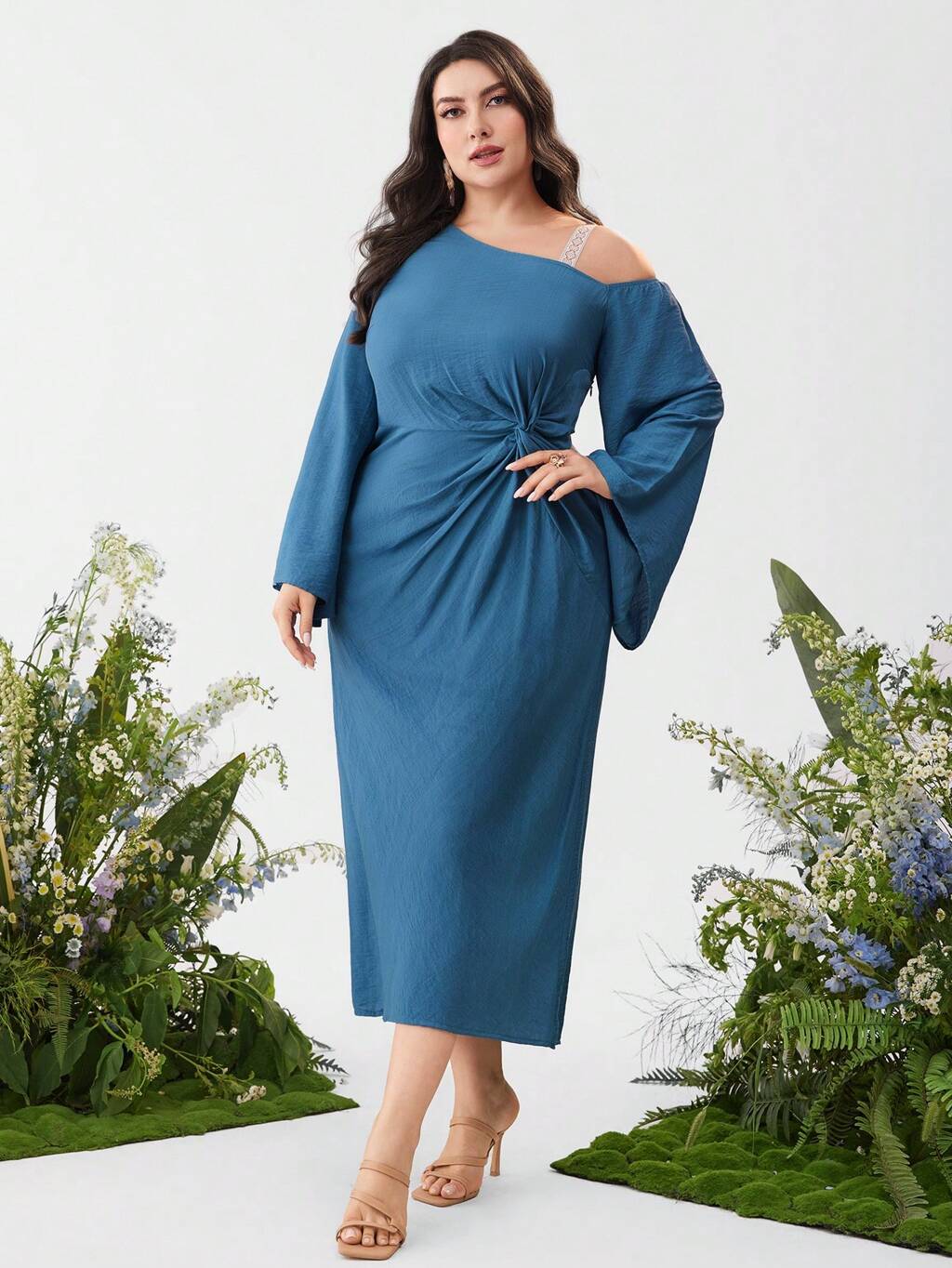 Plus Size Women's Solid Color Simple Daily Asymmetrical Neck Dress, Wedding Guest Dress