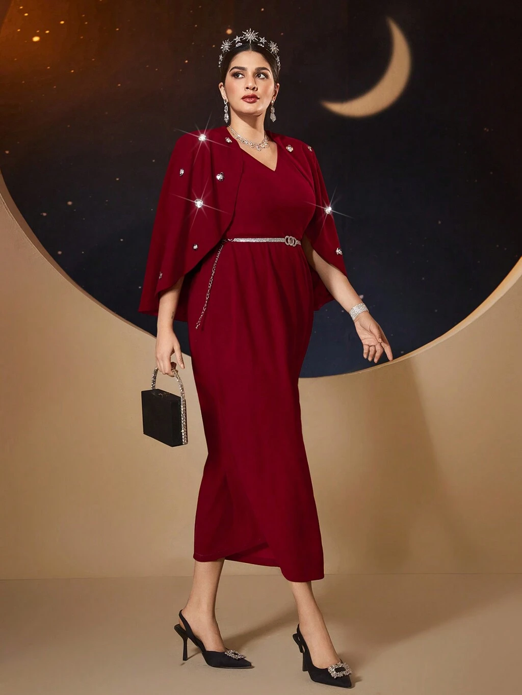 Burgundy Red Plus Size Women's Cape Style Glitter Dress,Elegant Evening Party Dress Long Evening Dresses