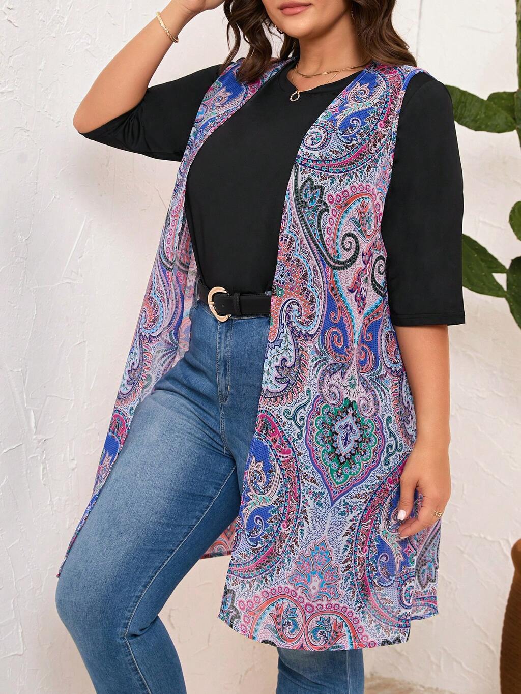 Women's Plus Size Solid Color T-Shirt And Printed Vest Jacket 2pcs/Set