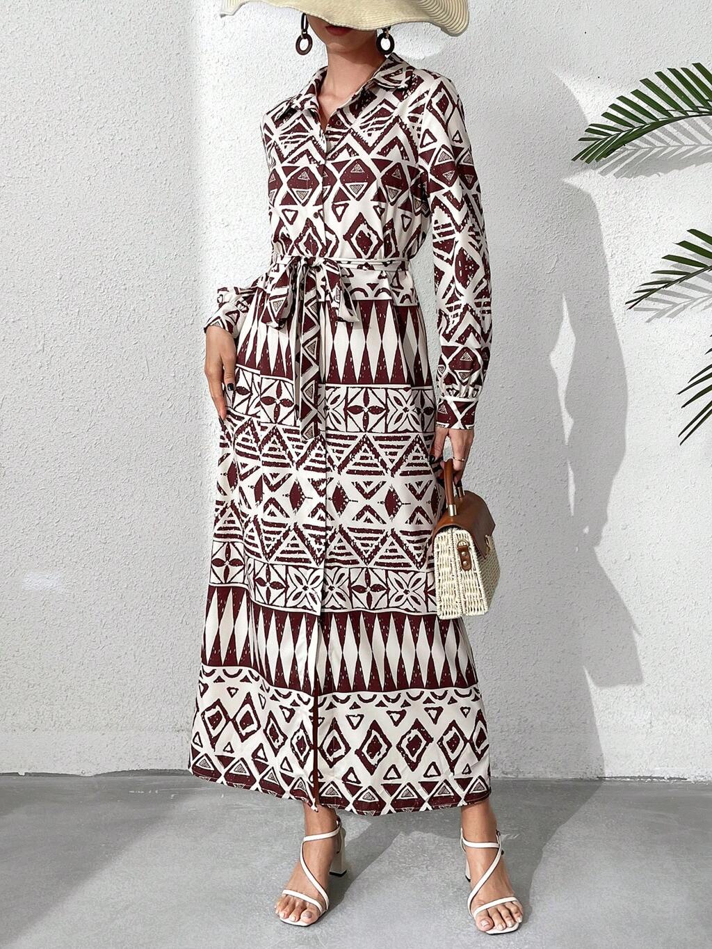 Retro Print Puff Sleeve Belted Dress Long Evening Dresses