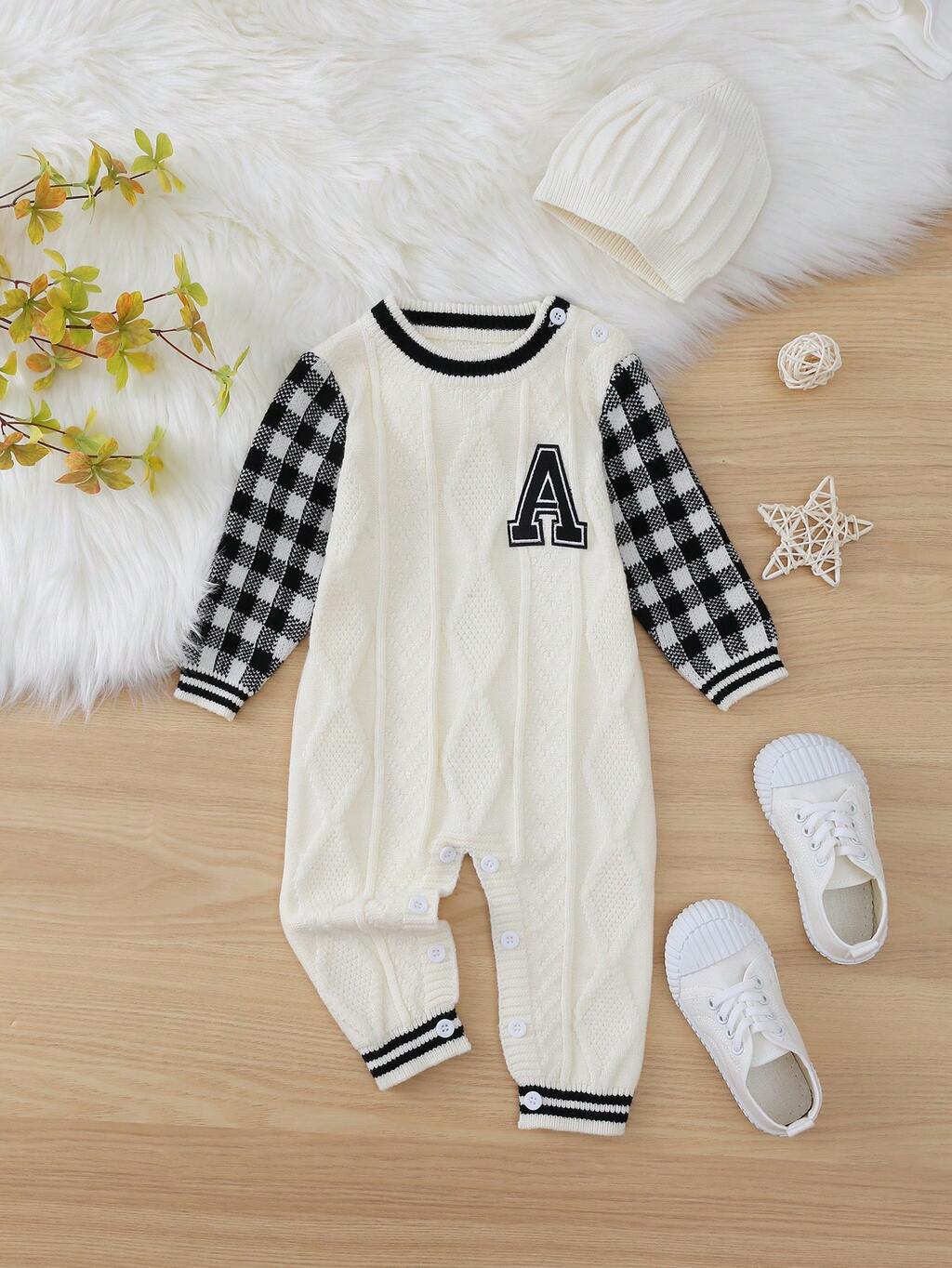 Baby Girl Contrast Gingham Sleeve Letter Patched Striped Trim Cable Knit Jumpsuit