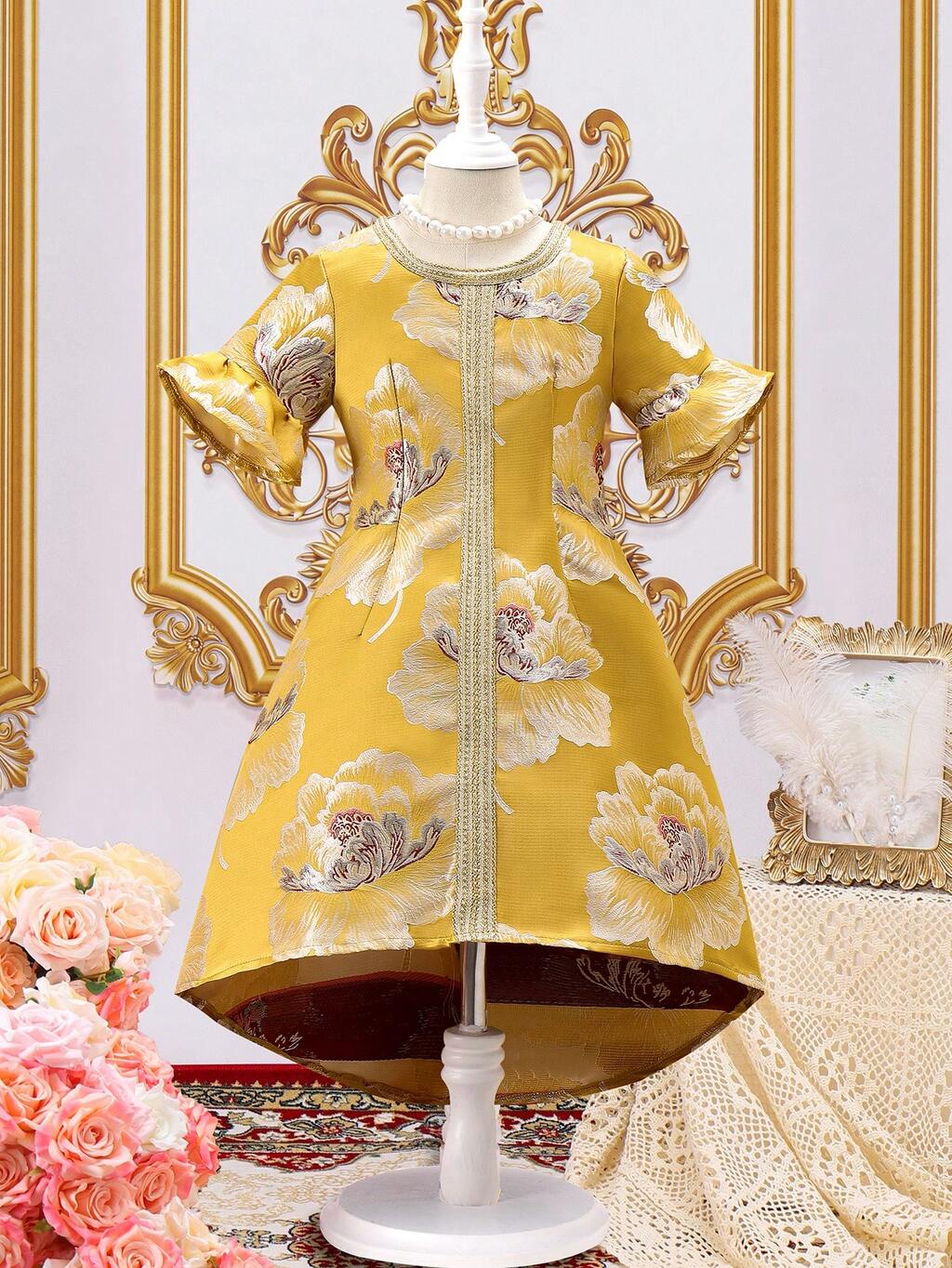 Young Girls' Floral Jacquard Patchwork Tape Trim Round Neck Dress