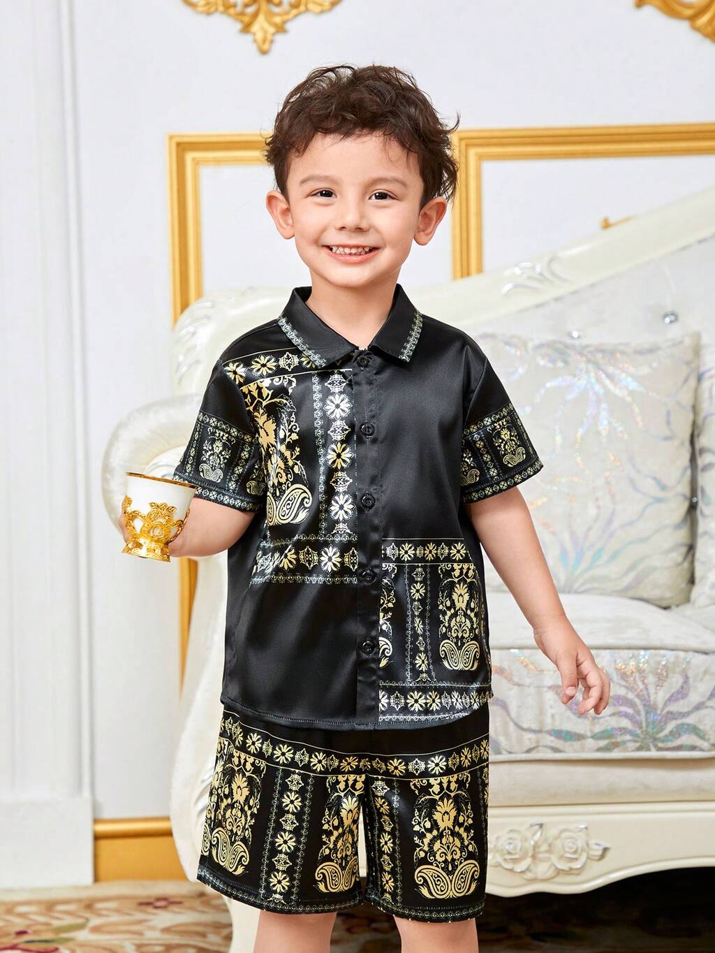 Young Boy Matching Paisley Print Short Sleeve Shirt And Shorts Set With Turn-Down Collar