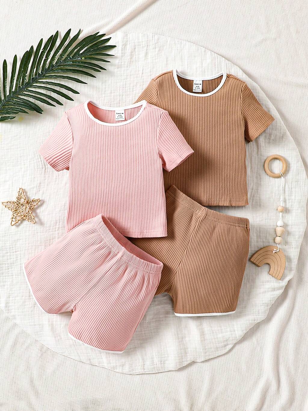 Baby Girl Leisure Solid Color Short Sleeve T-Shirt And Shorts Home Wear Set In Knitted Fabric, 4pcs