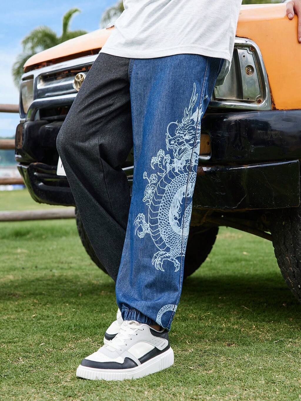 Teen Boy Casual Wash Color Contrast Pattern Dragon Print Fashion Street Comfortable Baggy Jeans For Vacation And Dailywear