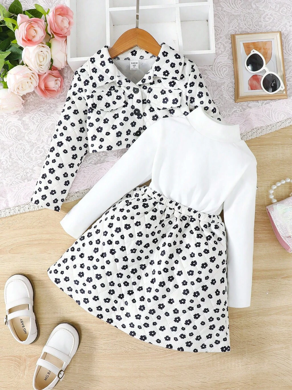 Young Girl Ditsy Floral Print Quilted Jacket & Dress