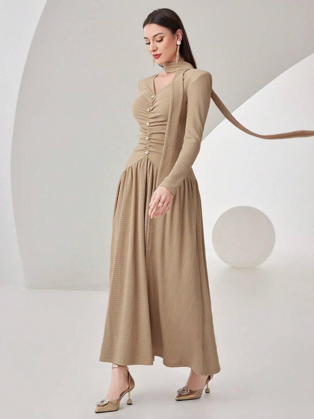 Asymmetrical Neck Button Front Pleated Hem Dress