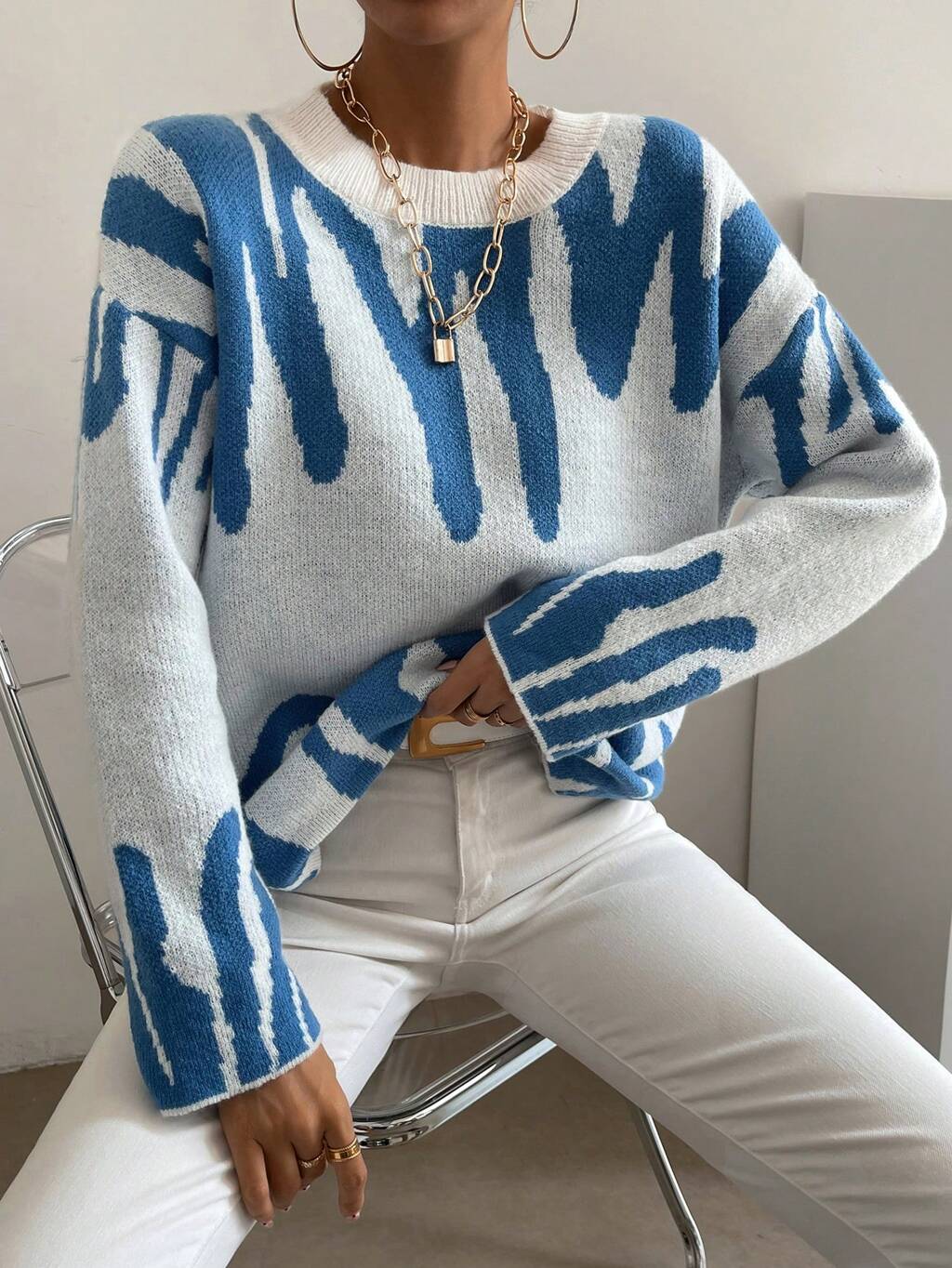Graphic Pattern Drop Shoulder Knit Pullover Fall Winter Sweater