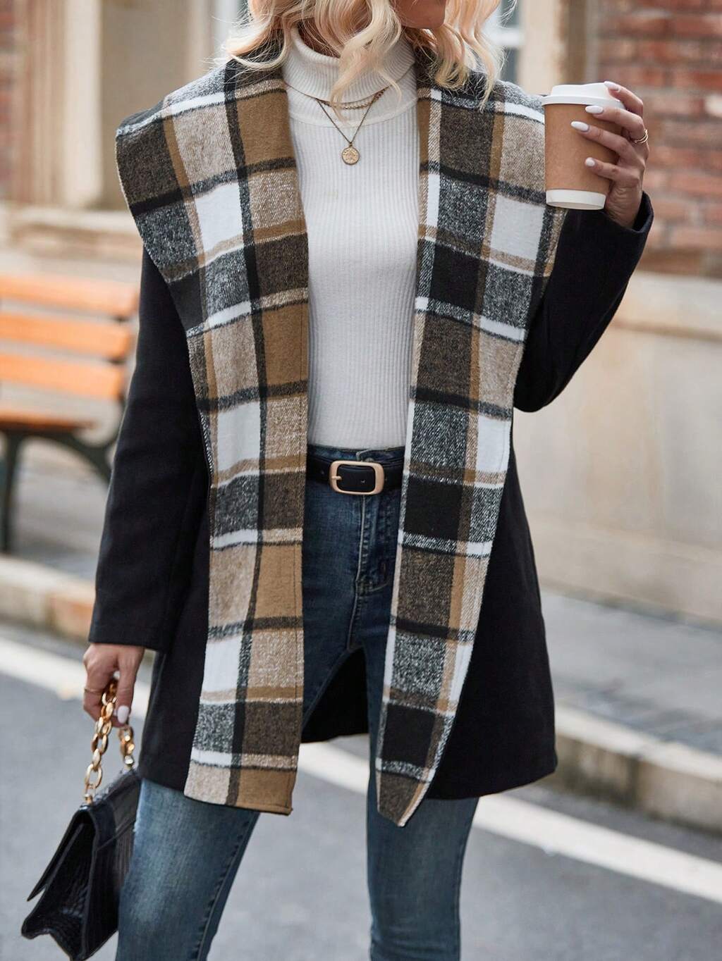 Plaid Print Lapel Neck Belted Overcoat Fall Cloth For Women