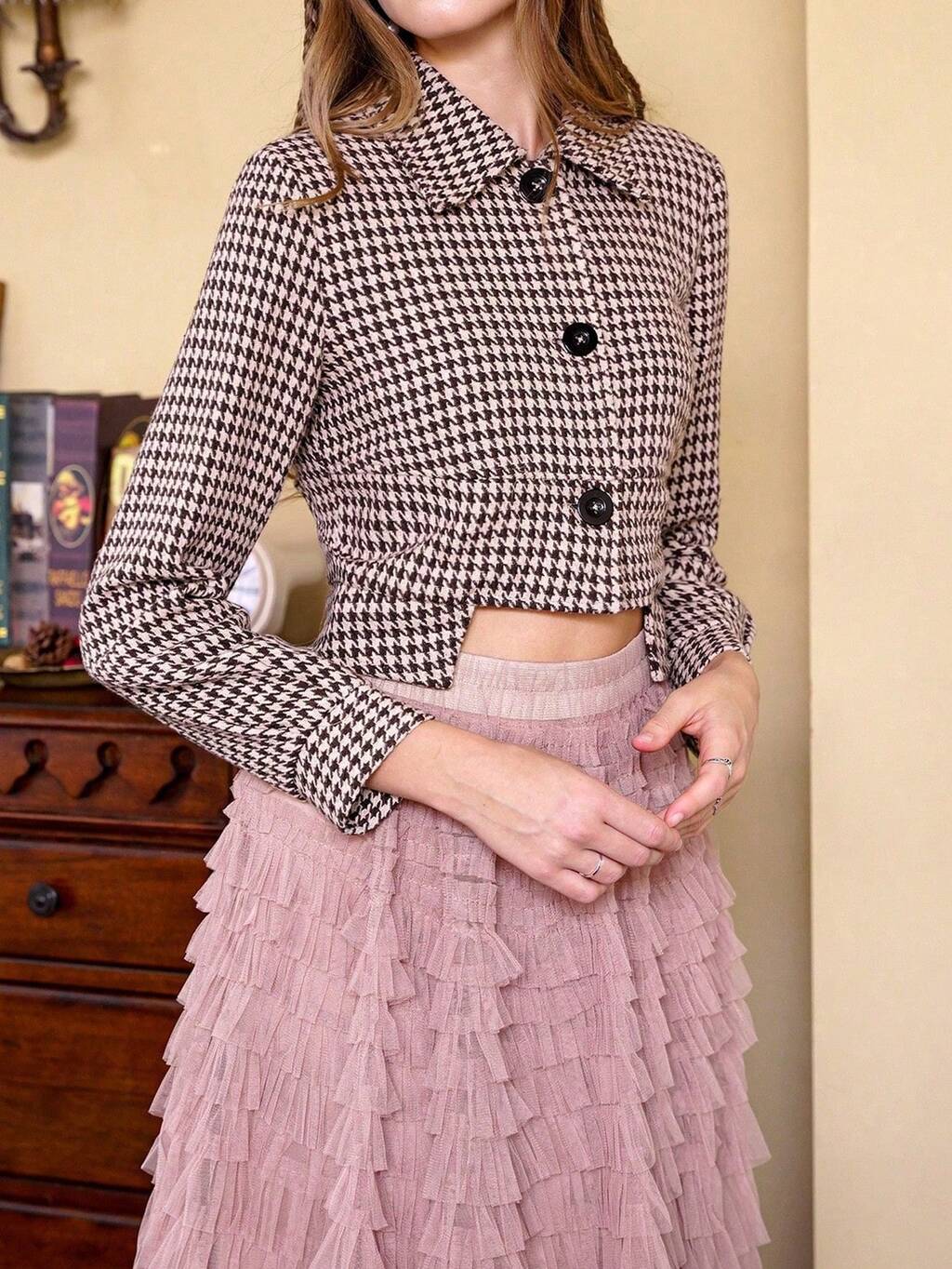Houndstooth Print Button Front Crop Overcoat Fall Cloth For Women