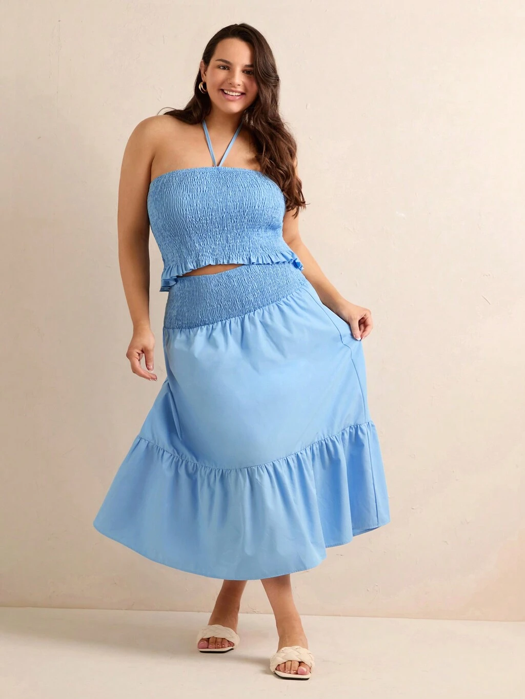 Plus Size Women's Solid Color Patchwork Halter Neck Ruffled Hem Midi Dress